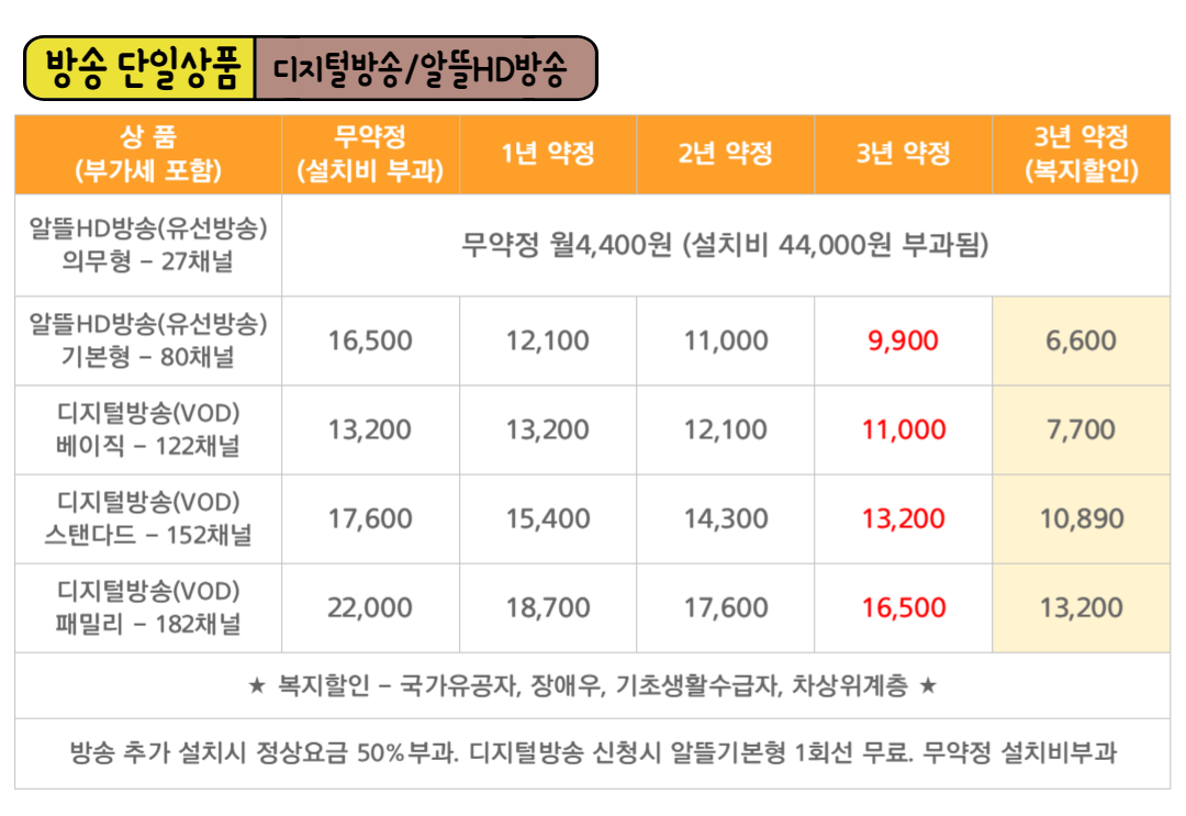 1년이상 약정과 자동이체(카드결재) 조건 - 설치비 44,000원 면제 혜택.