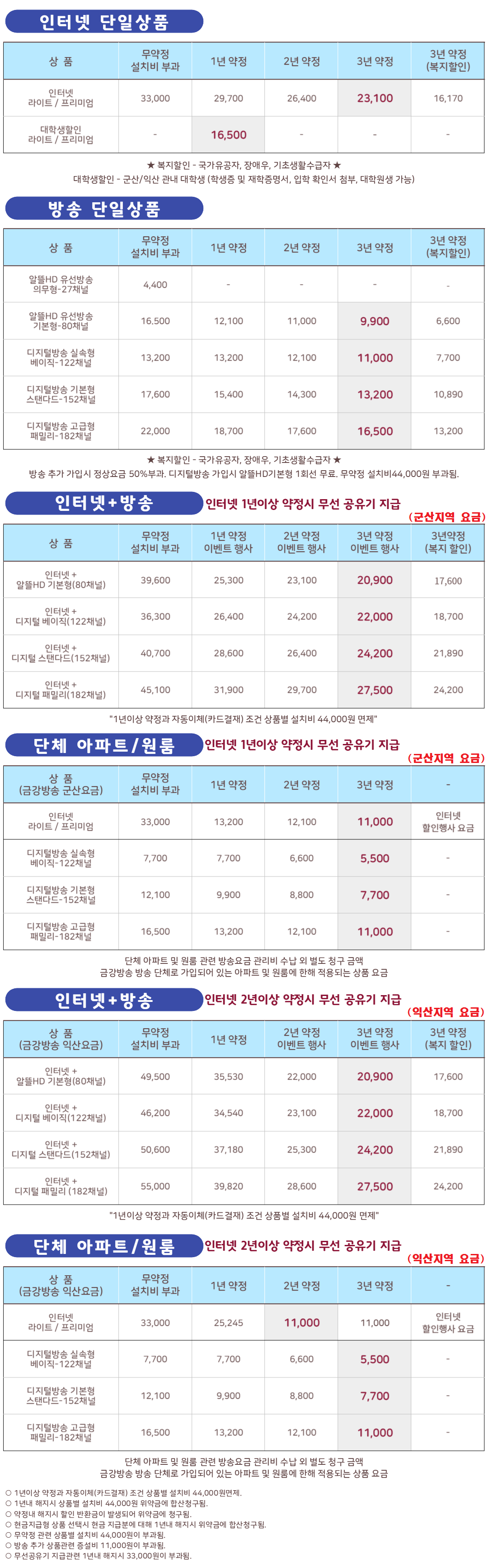 익산시 지역 군산시 지역 상품별 요금이 상이 하므로, 요금표를 꼭!! 확인해 주시고 상품 가입 관련 문의는 금강방송 군산센터/익산센터 로 전화 문의 주시면 빠르고 정확한 정보 확인이 가능하십니다.